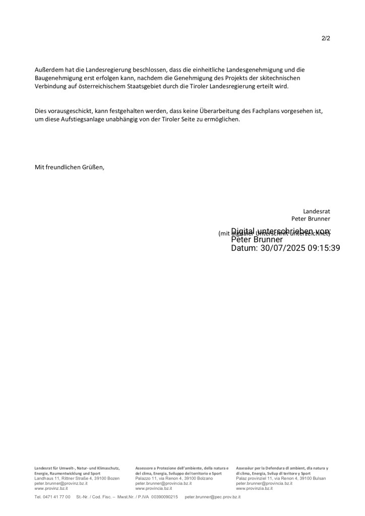 Ebenso ist bekannt, dass die Südtiroler UVP-Genehmigung im August 2025 ausläuft. In diesem Zusammenhang stellt sich die Frage: Gibt es Bemühungen seitens der Gemeinde Sexten und/oder des Landes, eine Baukonzession anzustreben, obwohl die im Beschluss genannten Voraussetzungen bislang nicht erfüllt sind?