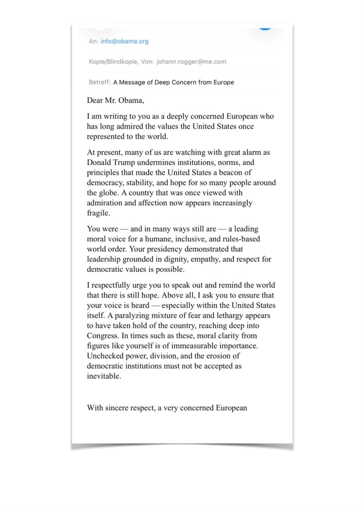 I respectfully urge you to speak out and remind the world that there is still hope. Above all, I ask you to ensure that your voice is heard — especially within the United States itself. A paralyzing mixture of fear and lethargy appears to have taken hold of the country, reaching deep into Congress. In times such as these, moral clarity from figures like yourself is of immeasurable importance. Unchecked power, division, and the erosion of democratic institutions must not be accepted as inevitable.